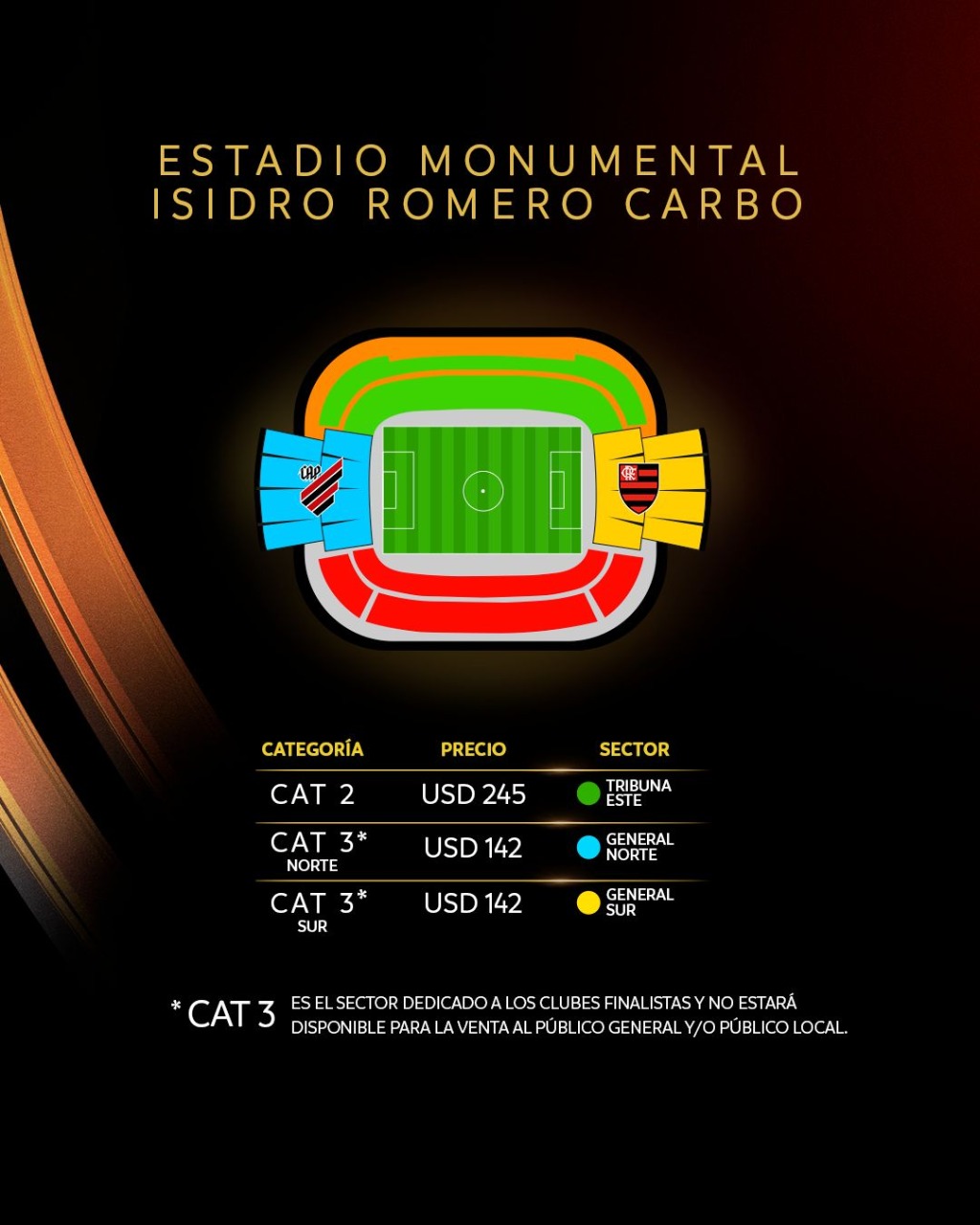 Según la CONMEBOL, los precios están definidos por categorías, la categoría 2 (general norte y sur): costará 142 dólares. La Geneal Norte será para la hinchada del Atlético Paranaense mientras que la Sur será para el Flamengo. Y la categoría 3 (tribuna este) para público en general está en 245 dólares.