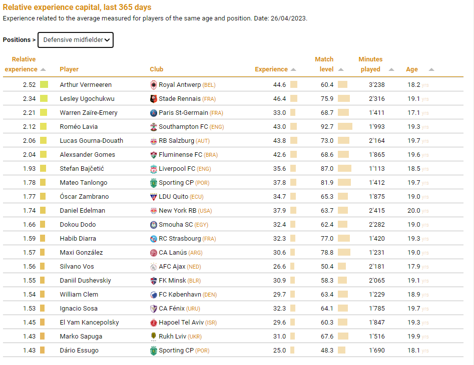Además, el capital de experiencia se relacionó con el promedio medido para jugadores de la misma edad y posición, lo que nos permite presentar un puntaje relativo como se mencionó anteriormente.