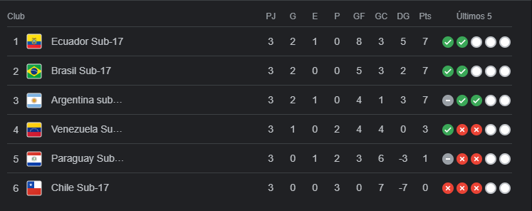 A falta de dos partidos, Ecuador, Brasil, juntos a Argentina aseguran un cupo en el Mundial Sub-17 mientras que Chile, Paraguay y Venezuela tendrán que luchar por el cuarto y último cupo. En la próxima fecha, a jugarse el próximo jueves a las 19:00, La Tri se enfrentará a su similar de Argentina.