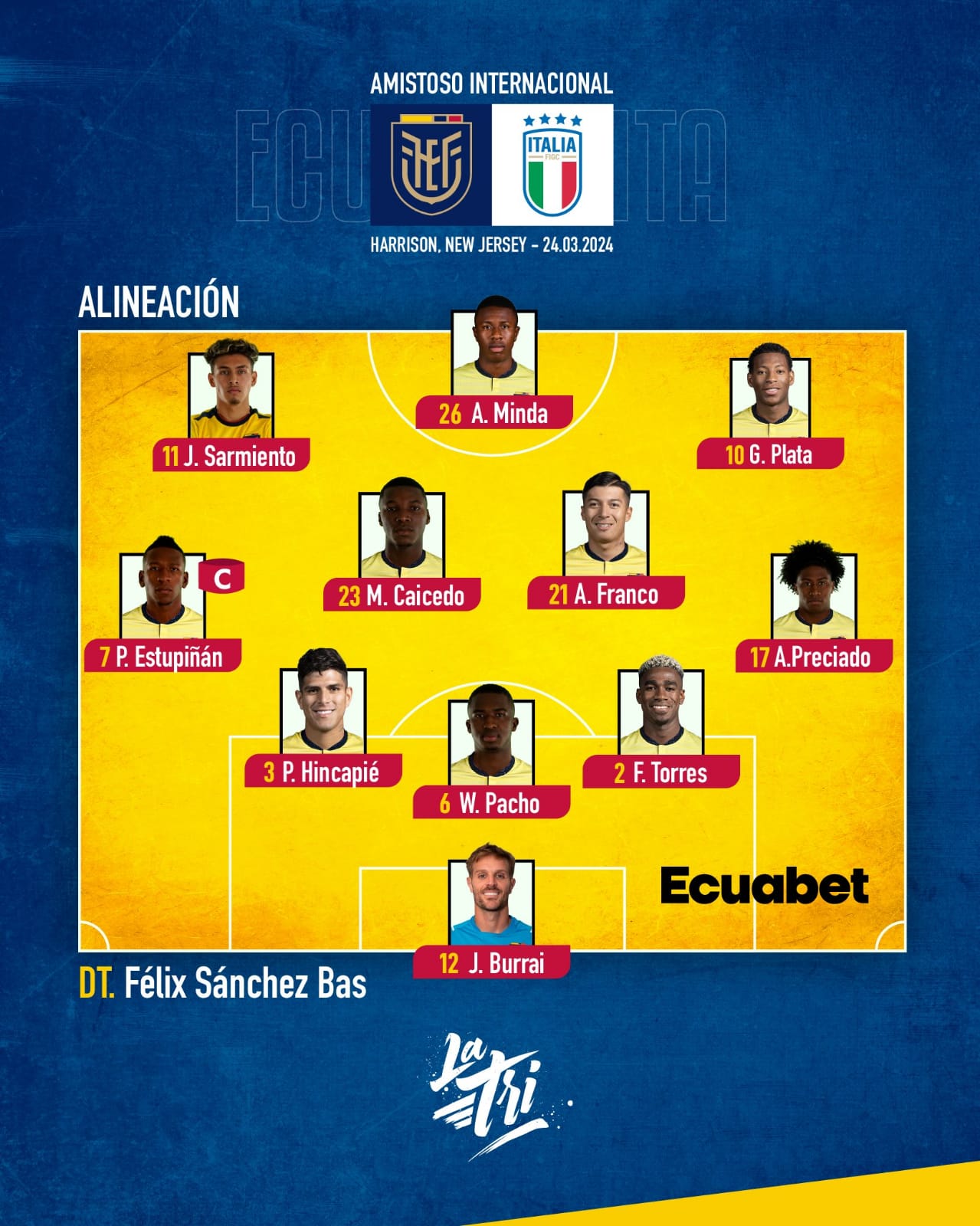 La alineación oficial de la salección de Ecuador queda así: