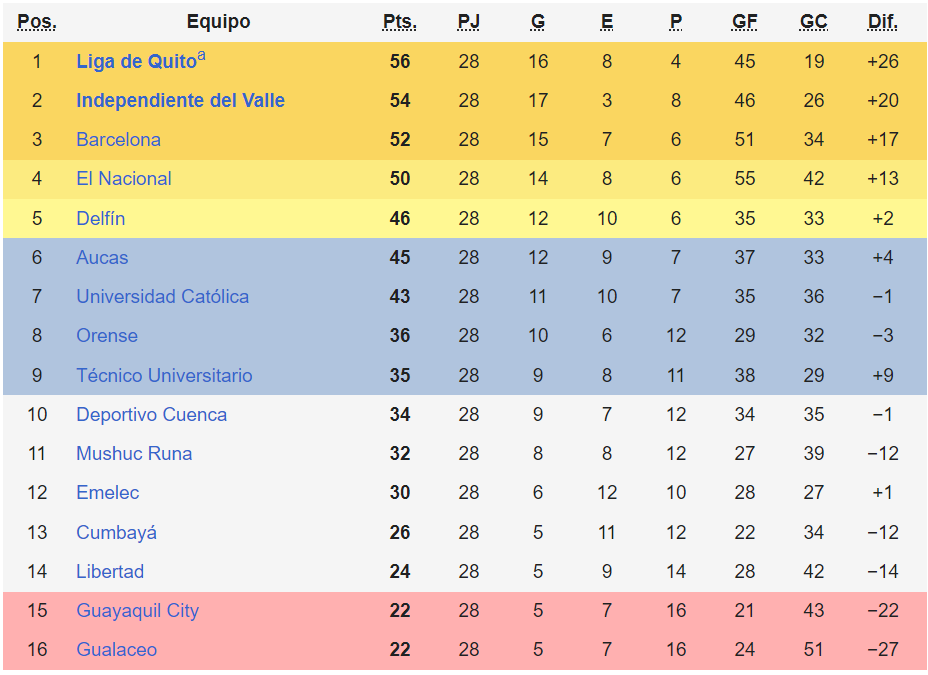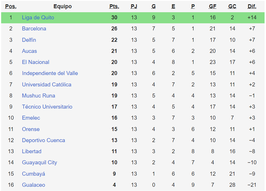 Tras la fecha 13, que se cerró el lunes en la noche con un empate sin goles entre Delfín y Deportivo Cuenca, la tabla de posiciones confirmó a Liga de Quito como líder de la segunda fase.