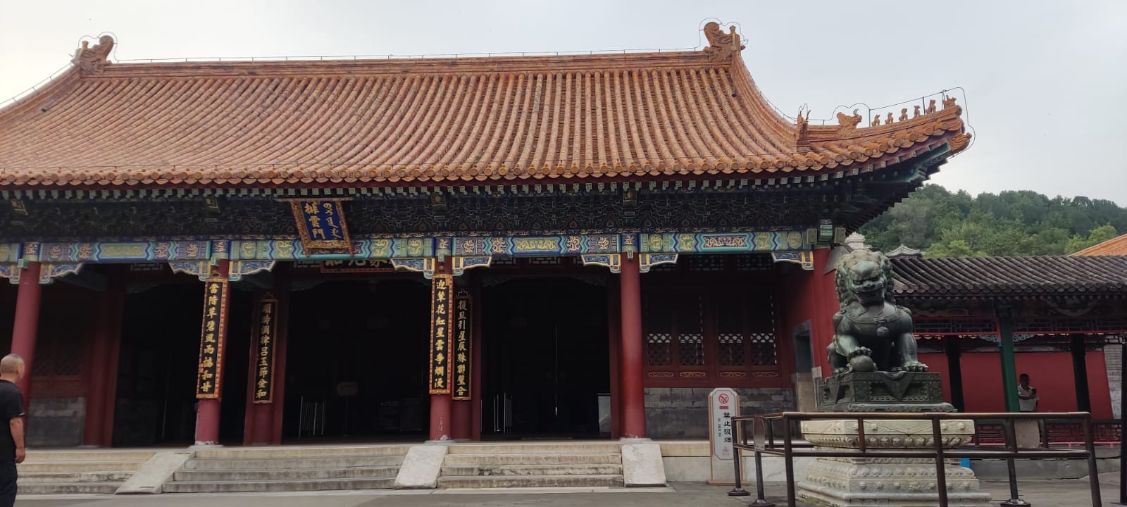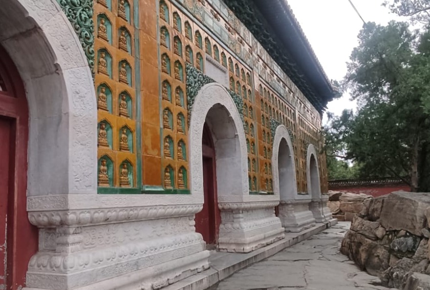 Uno de los templos que sorprende en el recorrido es la Sala del Mar de la Sabiduría. Sin vigas, erigida solo con ladrillo y piedra, es un prodigio de la arquitectura del periodo de Qianlong. Sus techos y muros, revestidos de esmaltes en cinco colores, esconden 1.110 figuras del Buda Amitayus. En los arcos que marcan la entrada, un verso budista recibe al visitante: “el reino de las fragancias, el bosque de árboles sala, el mar de sabiduría y las nubes de buenos augurios”.
