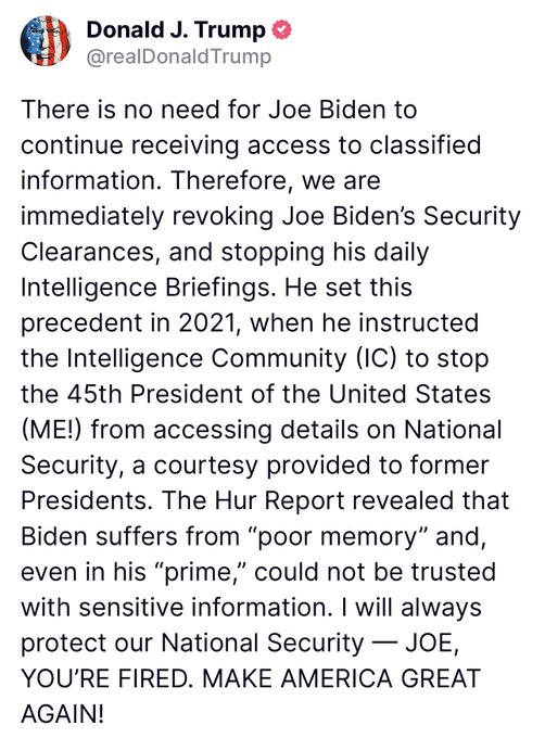 "Joe, estás despedido", fue el controvertido mensaje que publicó el presidente estadounidense Donald Trump, después de revocar el acceso a información clasificada a su antecesor Joe Biden.