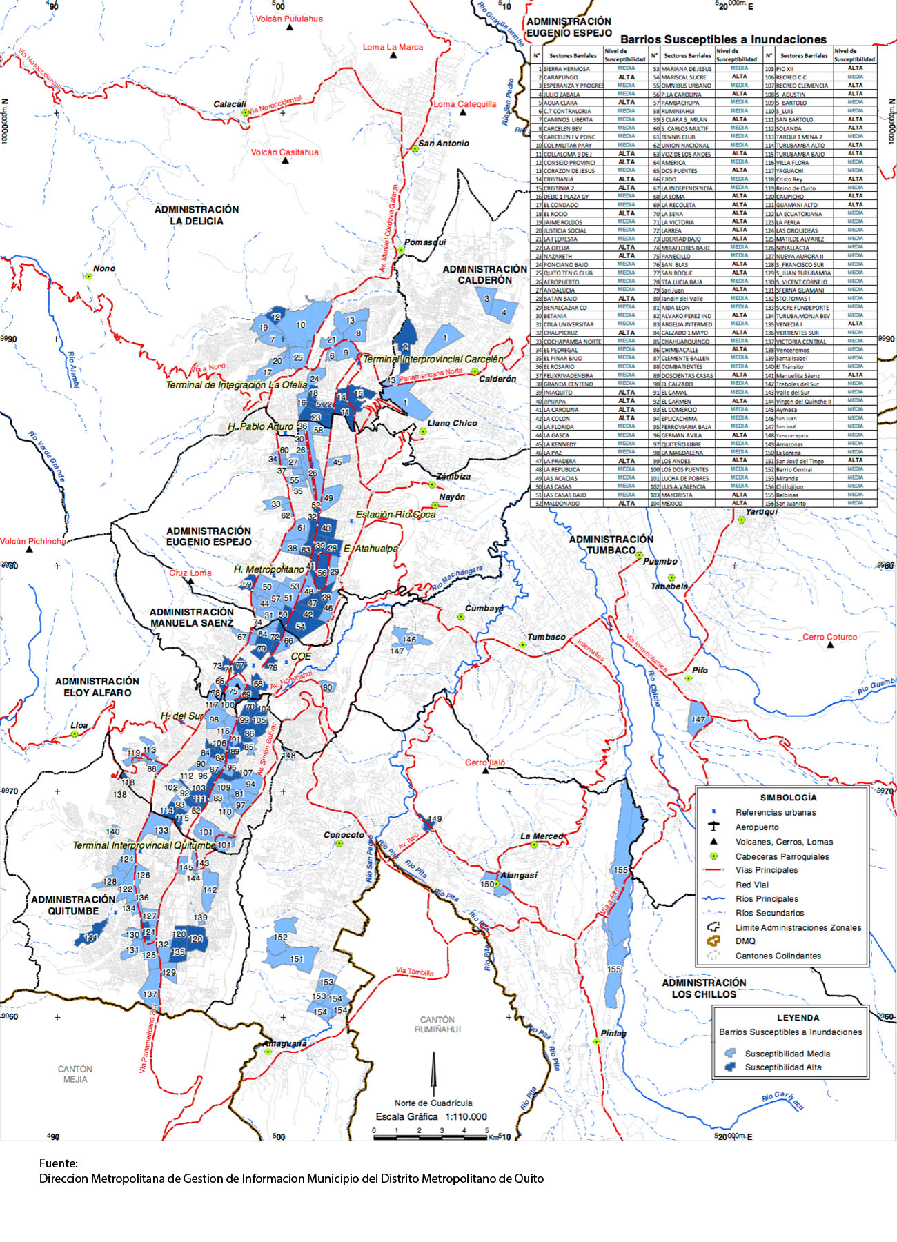 De acuerdo con el Atlas de Amenazas Naturales y Exposición de Infraestructura del Distrito Metropolitano de Quito, existen 156 barrios susceptibles a inundaciones.