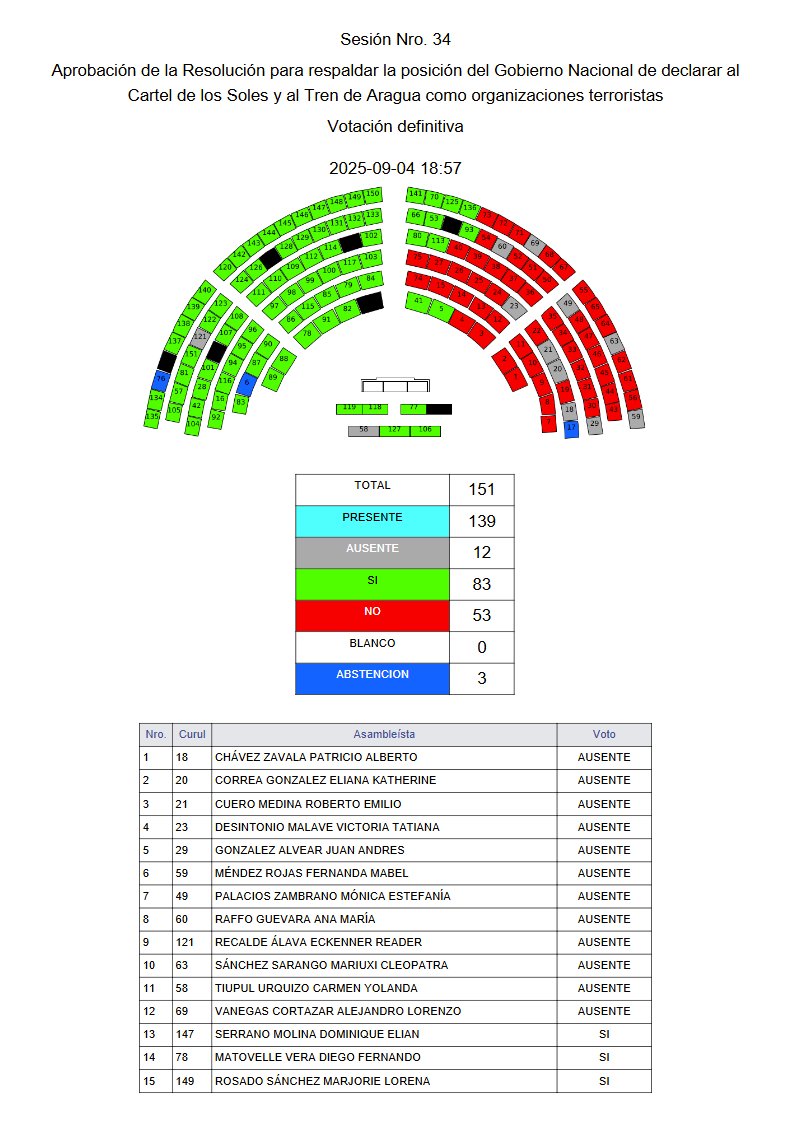 Ayer, jueves 4 de septiembre, con 83 votos a favor, 53 en contra —principalmente de la bancada de la Revolución Ciudadana— y 2 abstenciones, el Pleno de la Asamblea Nacional aprobó la resolución que respalda la decisión del Gobierno Nacional de declarar al Cartel de los Soles y al Tren de Aragua como organizaciones terroristas.