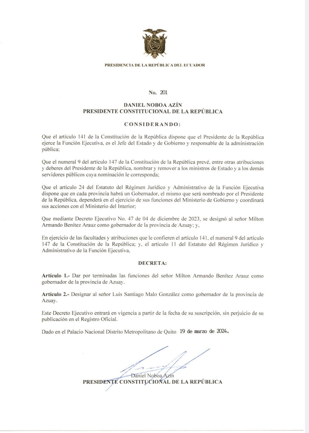 Mediante la emisión de dos nuevos decretos 201 y 204, el presidente Daniel Noboa realizó cambios en las gobernaciones de Azuay e Imbabura.