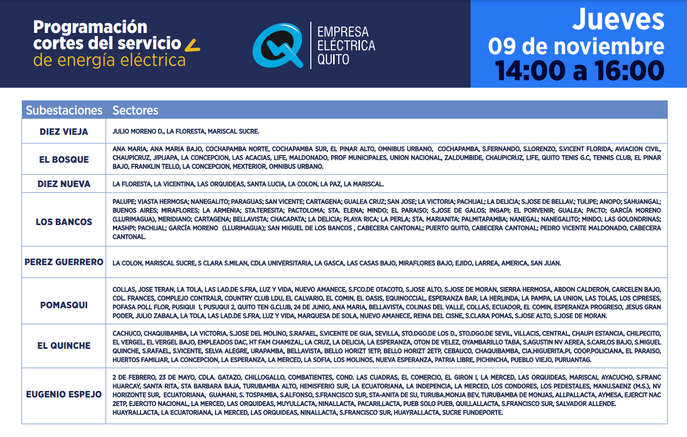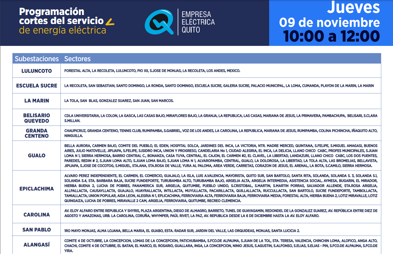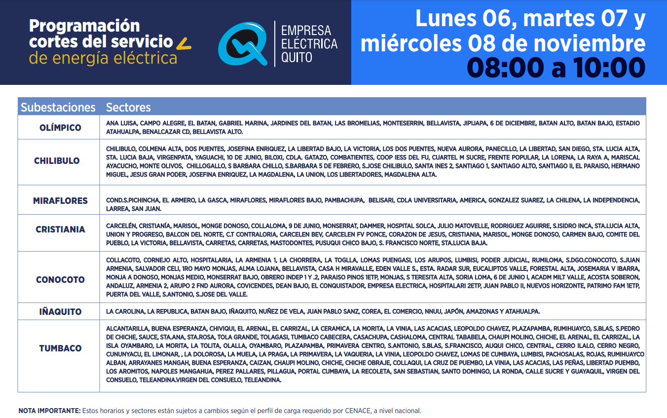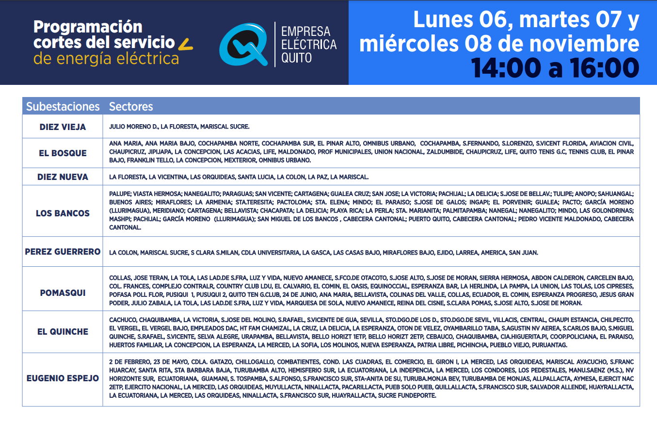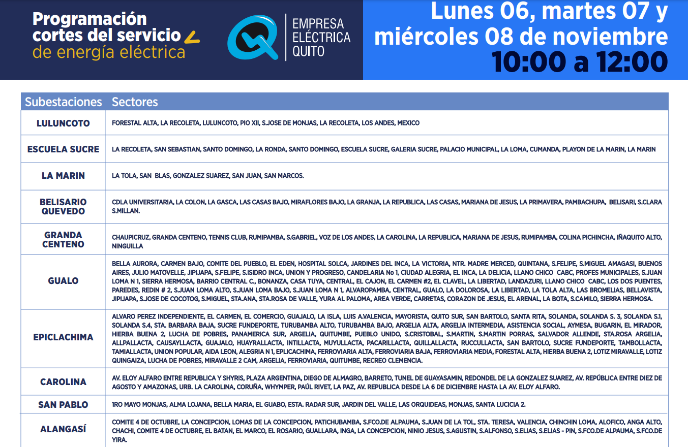 La Empresa Eléctrica Quito publicó, este domingo, 05 de noviembre de 2023, los horarios para los racionamientos de energía programados para los días lunes 06, martes 07, miércoles 08 y jueves 09 noviembre de 2023.