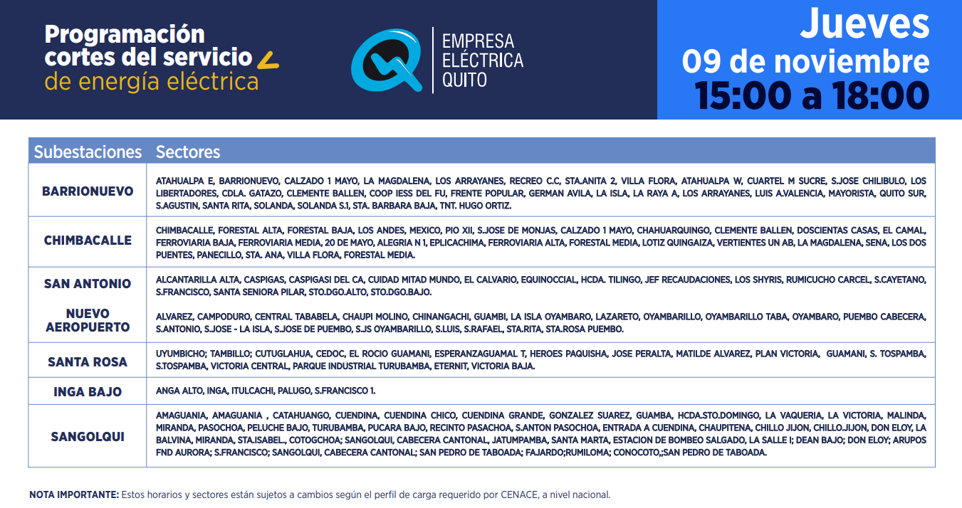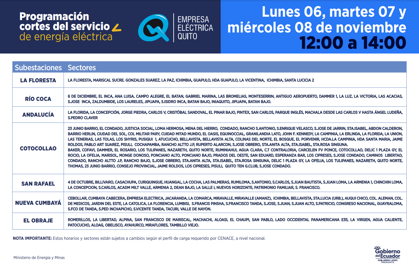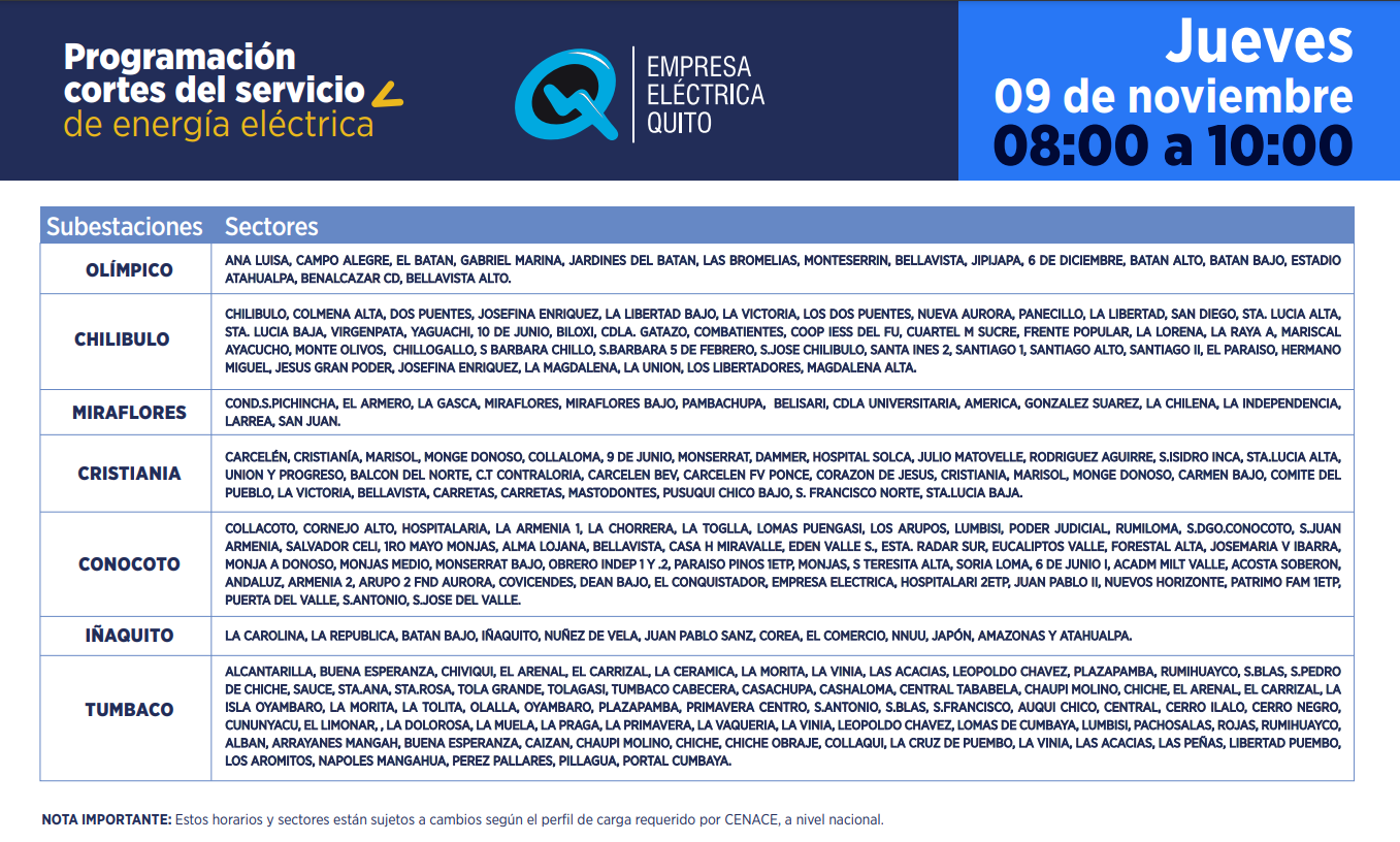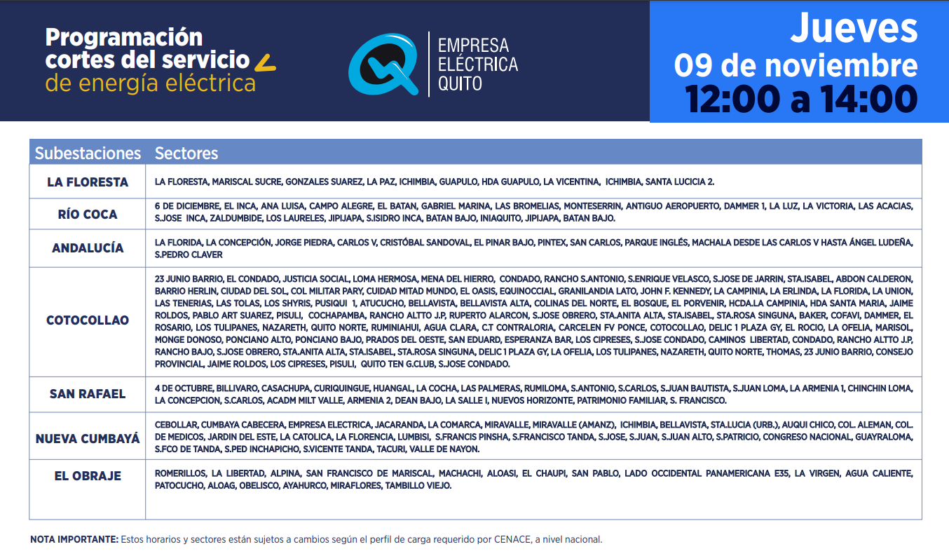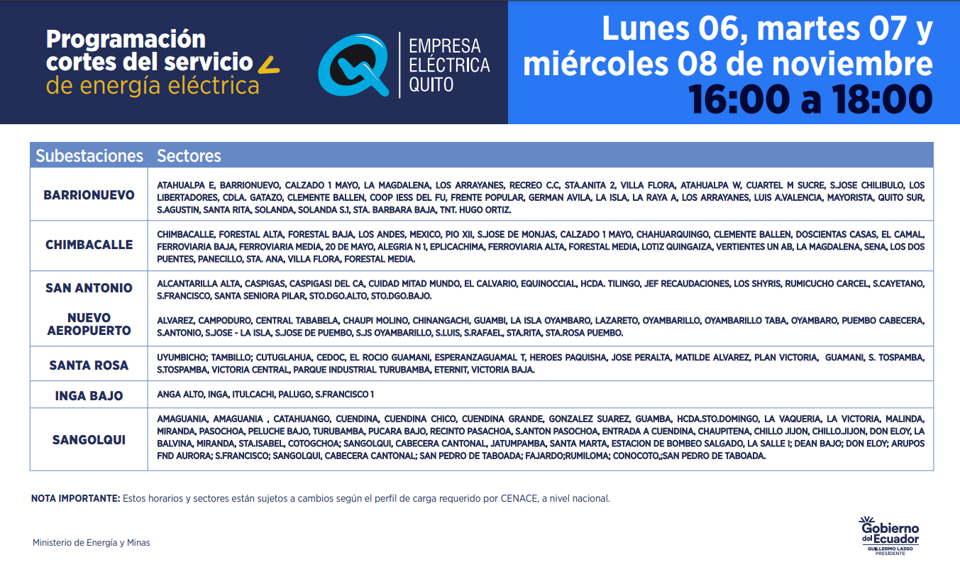 La Empresa Eléctrica Quito publicó, este domingo, 05 de noviembre de 2023, los horarios para los racionamientos de energía programados para los días lunes 06, martes 07, miércoles 08 y jueves 09 noviembre de 2023.