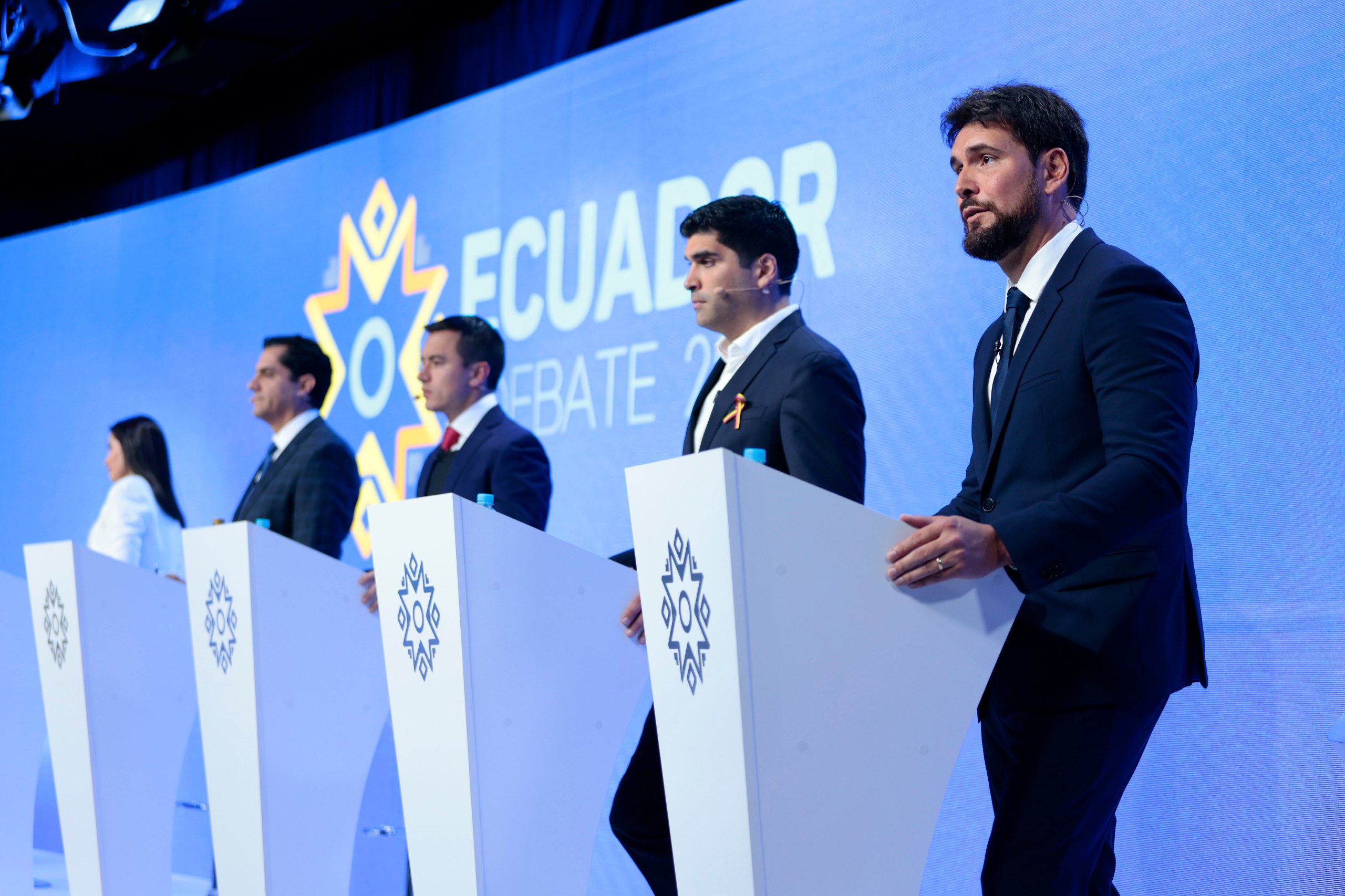 Los candidatos llegaron a partir de las 17:10 a la sede del Debate Presidencial en Ecuador TV. Daniel Noboa llegó con un chaleco antibalas, ya que habría recibido amenazas. El resto de aspirantes al Palacio de Carondelet arribaron acompañados de familiares y asesores.