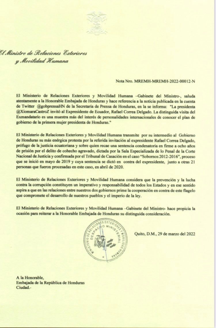 A través de una misiva enviada a la Embajada de Honduras en el Ecuador, el Ministerio de Relaciones Exteriores hizo pública su “más enérgica protesta” por la invitación que recibió Correa para encontrarse con Castro en Tegucigalpa y calificar la visita de “una muestra más del interés de personalidades internacionales de conocer el plan de gobierno de la primera mujer presidenta de Honduras”.