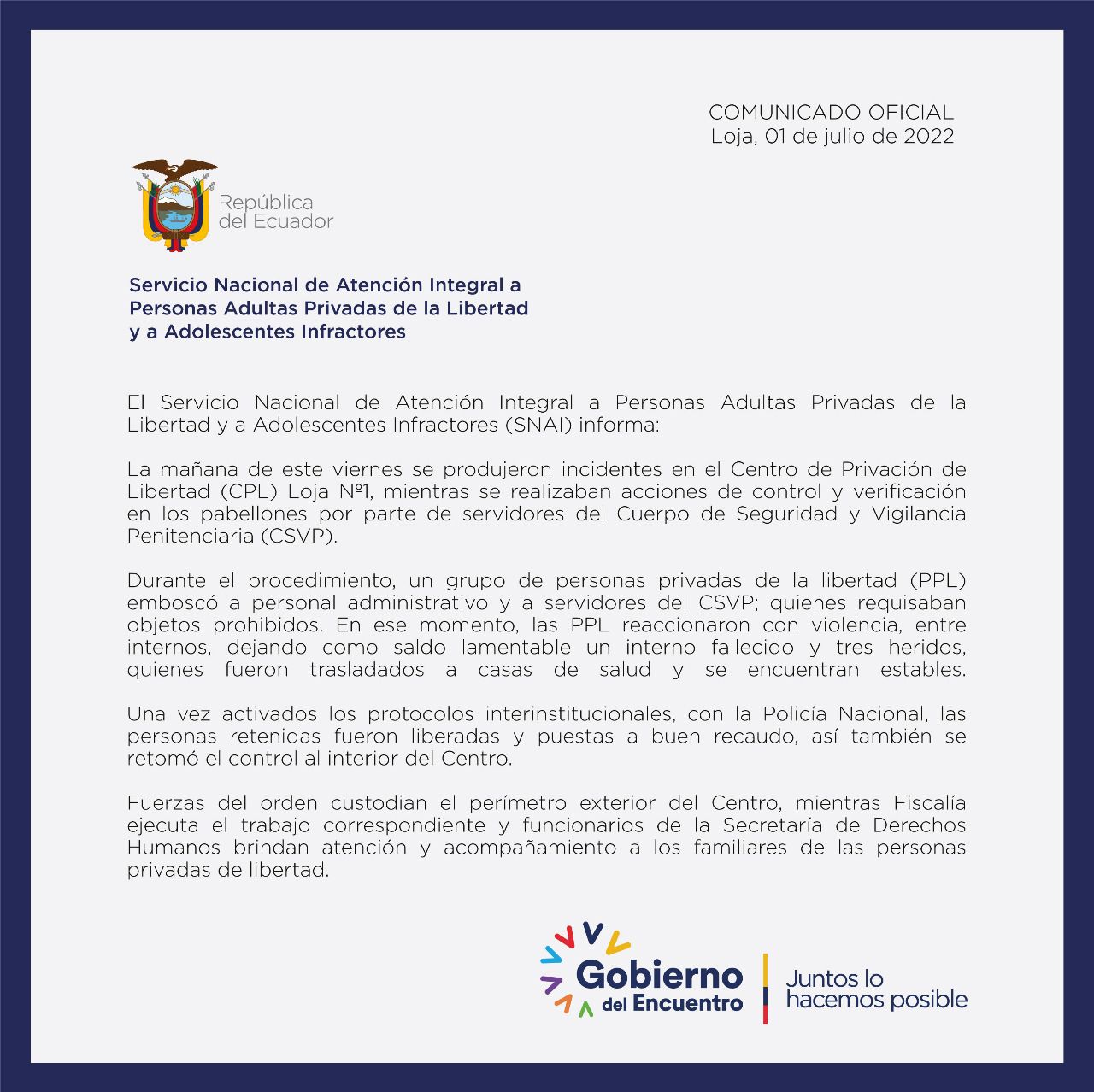 Finalmente, desde la SNAI, emitieron un comunicado con los detalles de lo ocurrido en la cárcel de Loja: