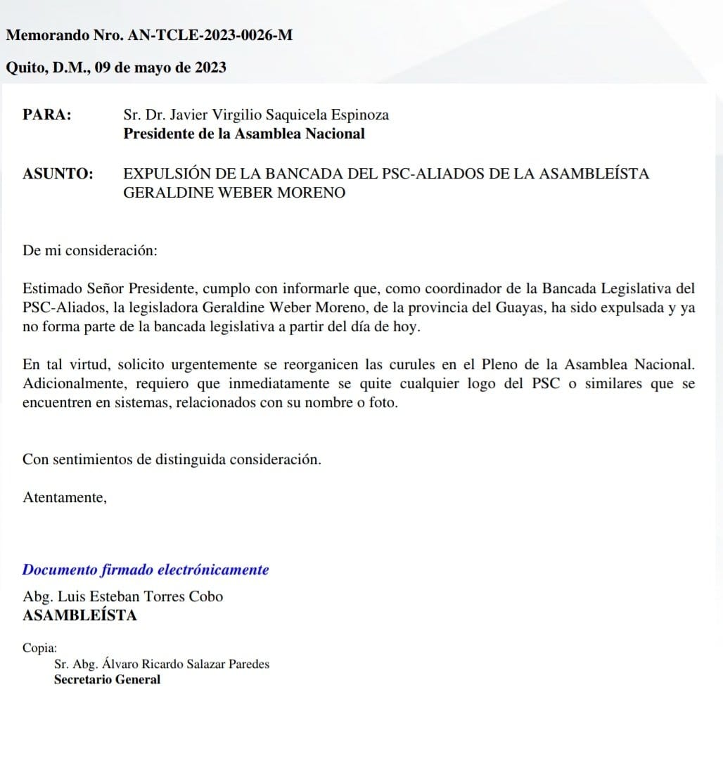 No obstante, minutos después Esteban Torres, jefe de bloque, envió una carta al presidente de la Asamblea notificando la expulsión de Weber y solicitando que se reorganicen las curules en el Pleno.