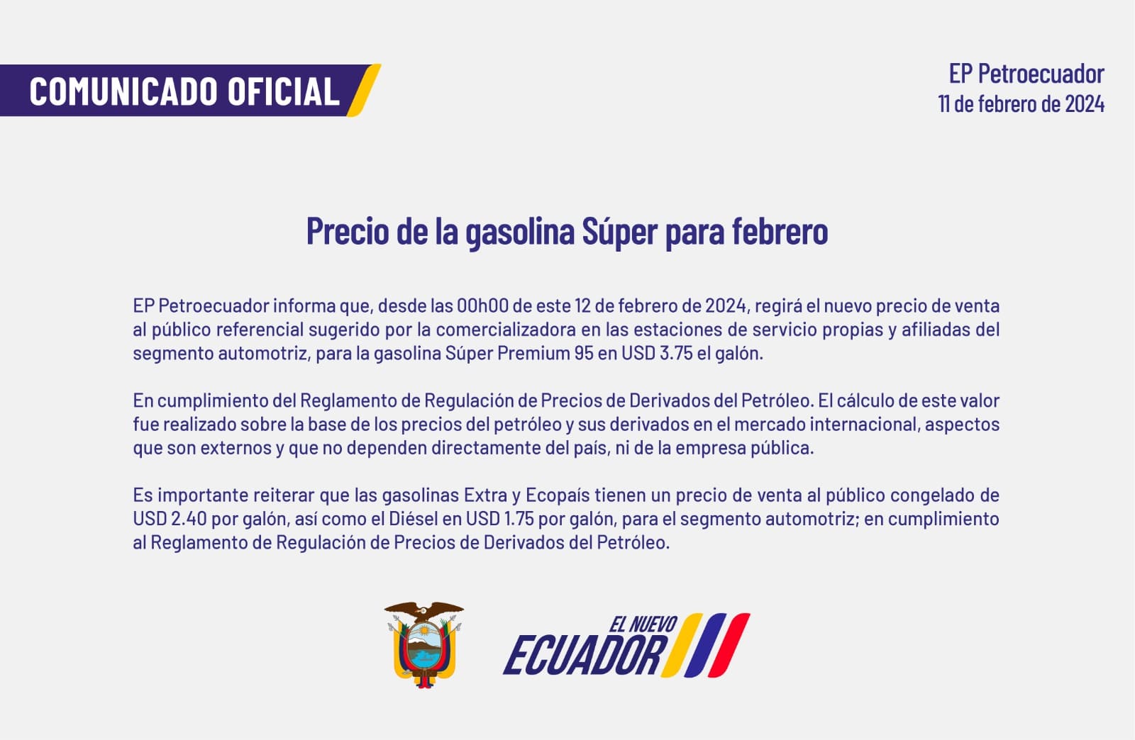 Petroecuador anunció los precios para la gasolina Súper que regirán desde la medianoche de este lunes, 12 de febrero de 2024.