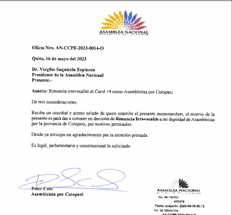 El presidente del Parlamento, Virgilio Saquicela, dio a conocer la renuncia “por motivos personales” al iniciar la sesión 872 del pleno. Inmediatamente, se posesionó a su alterna la legisladora Jeaneth Llano, quien ocupará la curul hasta el 2025.