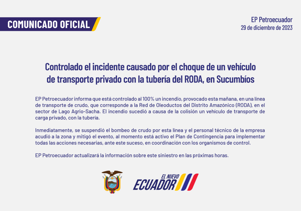 La estatal Petroecuador informó que el evento fue controlado. En un comunicado informó que el hecho fue provocado por el choque de un vehículo de transporte privado con la tubería del Red de Oleoductos del Distrito Amazónico (RODA).