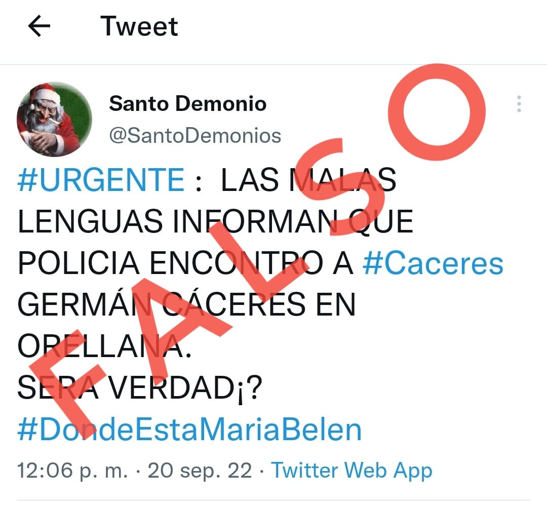La otra información que fue calificada por la Policía como “falsa” detallaba que la Policía encontró a Germán Cácares en la localidad oriental de Orellana.