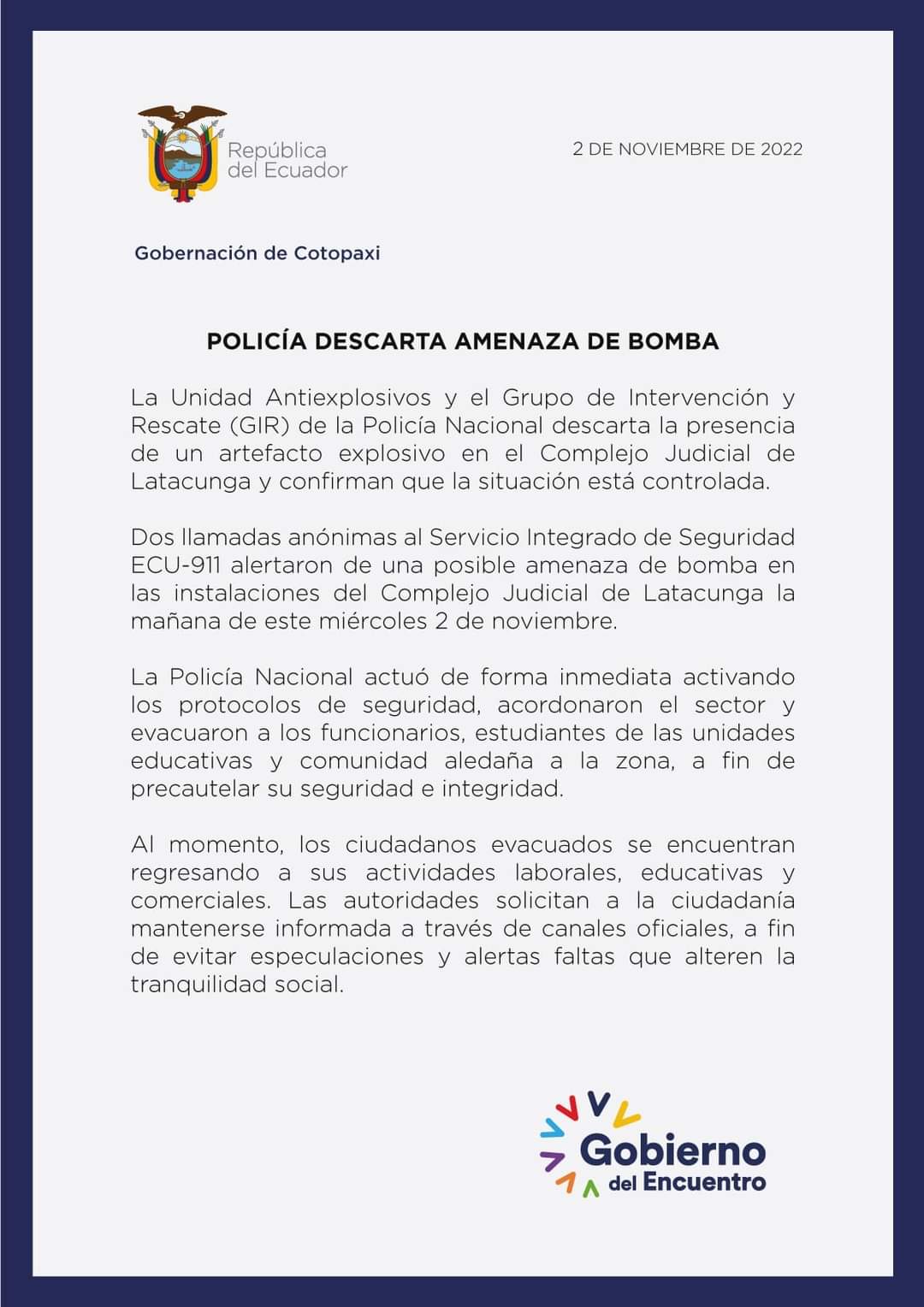 La mañana de este miércoles, 2 de noviembre de 2022, una amenaza de bomba alertó a los funcionarios y los alrededores del complejo judicial en Latacunga.