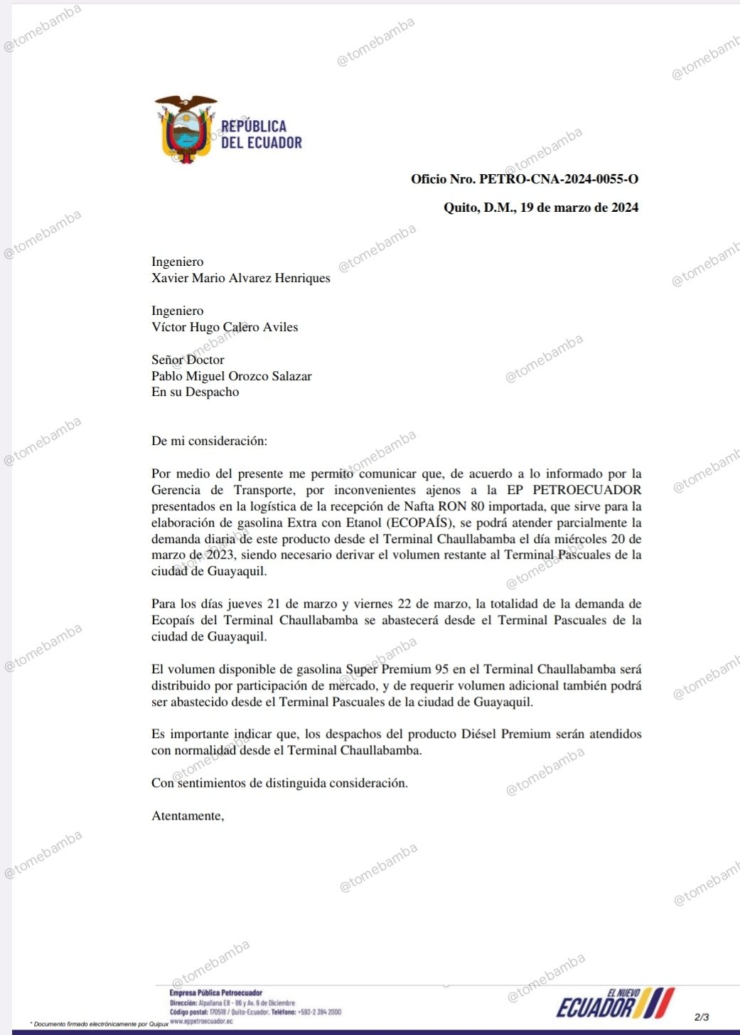 El oficio desde Petroecuador detalla que: “de acuerdo a lo informado por la Gerencia de Transporte, por inconvenientes ajenos a Petroecuador presentados en la logística de la recepción de Nafta RON 80 importada, que sirve para la elaboración de gasolina Extra con Etanol (ECOPAÍS), se podrá atender parcialmente la demanda diaria de este producto desde el Terminal Chaullabamba el día miércoles 20 de marzo de 2023, siendo necesario derivar el volumen restante al Terminal Pascuales de la ciudad de Guayaquil”. Los propietarios de las estaciones de servicio también podrán abastecerse de la terminal de Pascuales en Guayaquil sin embargo esta solución es cuestionada desde los representantes de las distribuidoras de gasolina en Cuenca.