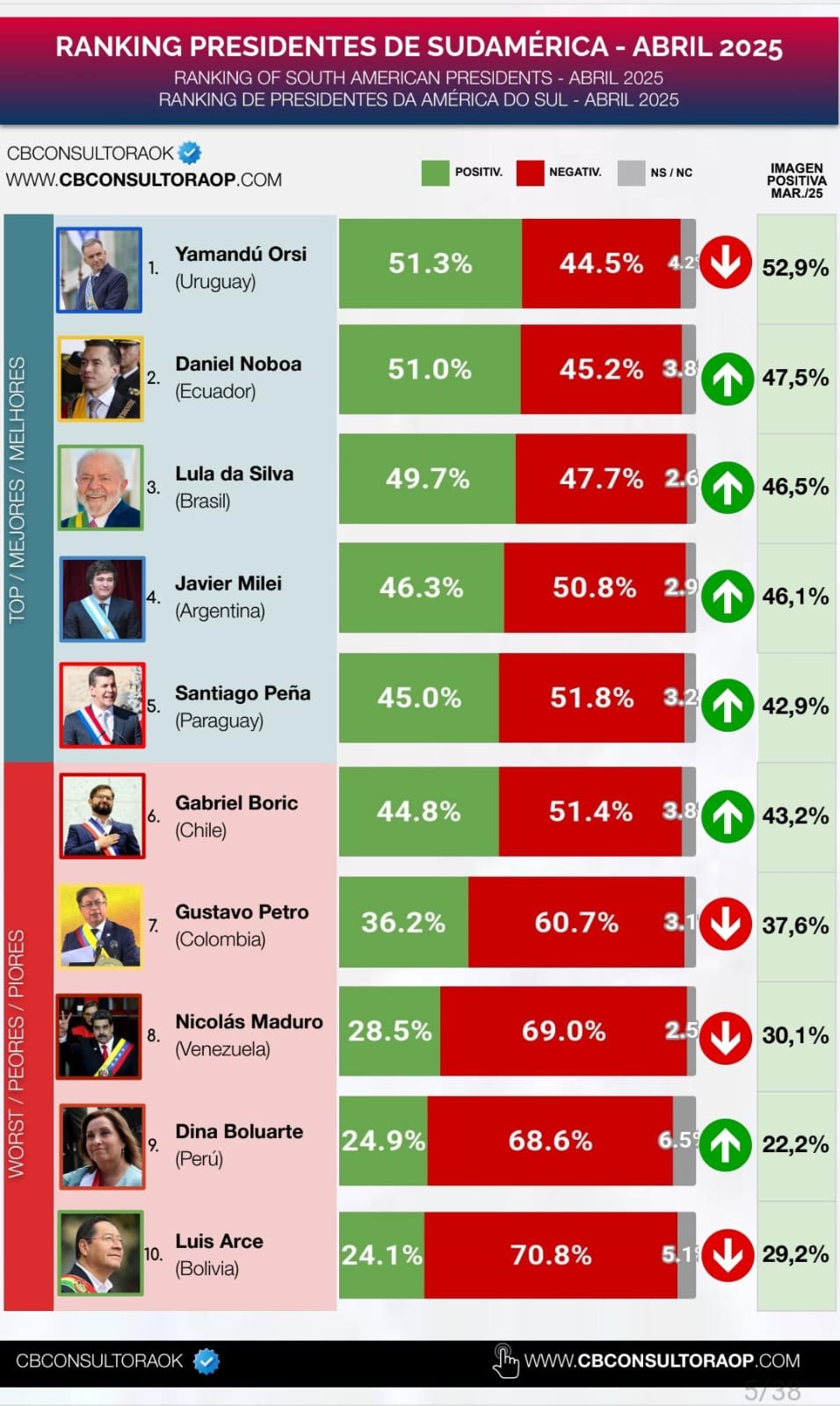 Con ello, el mandatario electo en los comicios del 13 de abril tiene el 51% de imagen positiva. Es superado con el presidente de Uruguay, Yamandú Orsi.