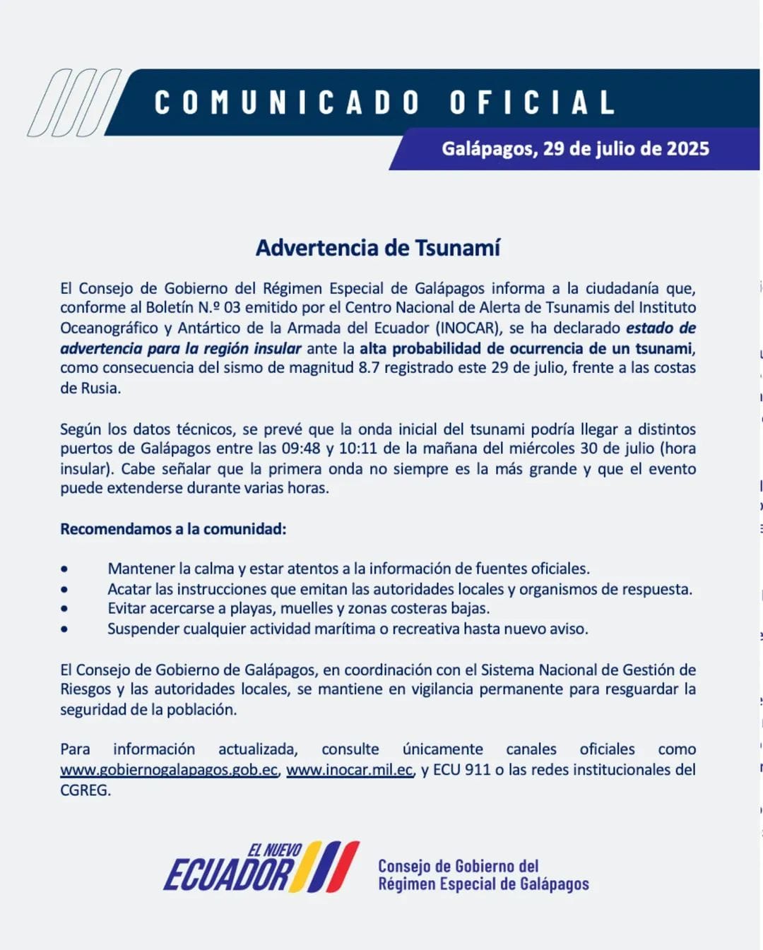 “Inocar emite este mensaje como guía para las agencias gubernamentales encargadas de la gestión de alertas de seguridad pública”, precisaron en el comunicado oficial.