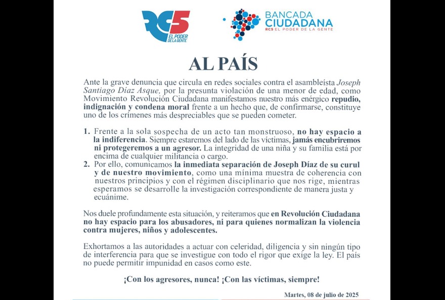 La bancada de la Revolución Ciudadana (RC5) anunció la separación del asambleísta Joseph Santiago D., quien estaría presuntamente involucrado en un caso de violación a una menor de edad.