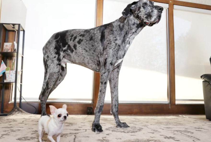 En una conmovedora reunión organizada por Guinness World Records, Reggie, un gran danés de siete años que mide 1,007 metros de altura, y Pearl, una chihuahua de cuatro años con apenas 9,14 centímetros de estatura, se encontraron por primera vez en Idaho Falls, Estados Unidos. A pesar de la abismal diferencia de tamaño, ambos canes demostraron una conexión inmediata y afectuosa.