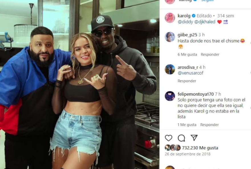 Karol G, a través de su cuenta de Instagram, sale en una foto acompañada de Combs y de DJ Khaled.